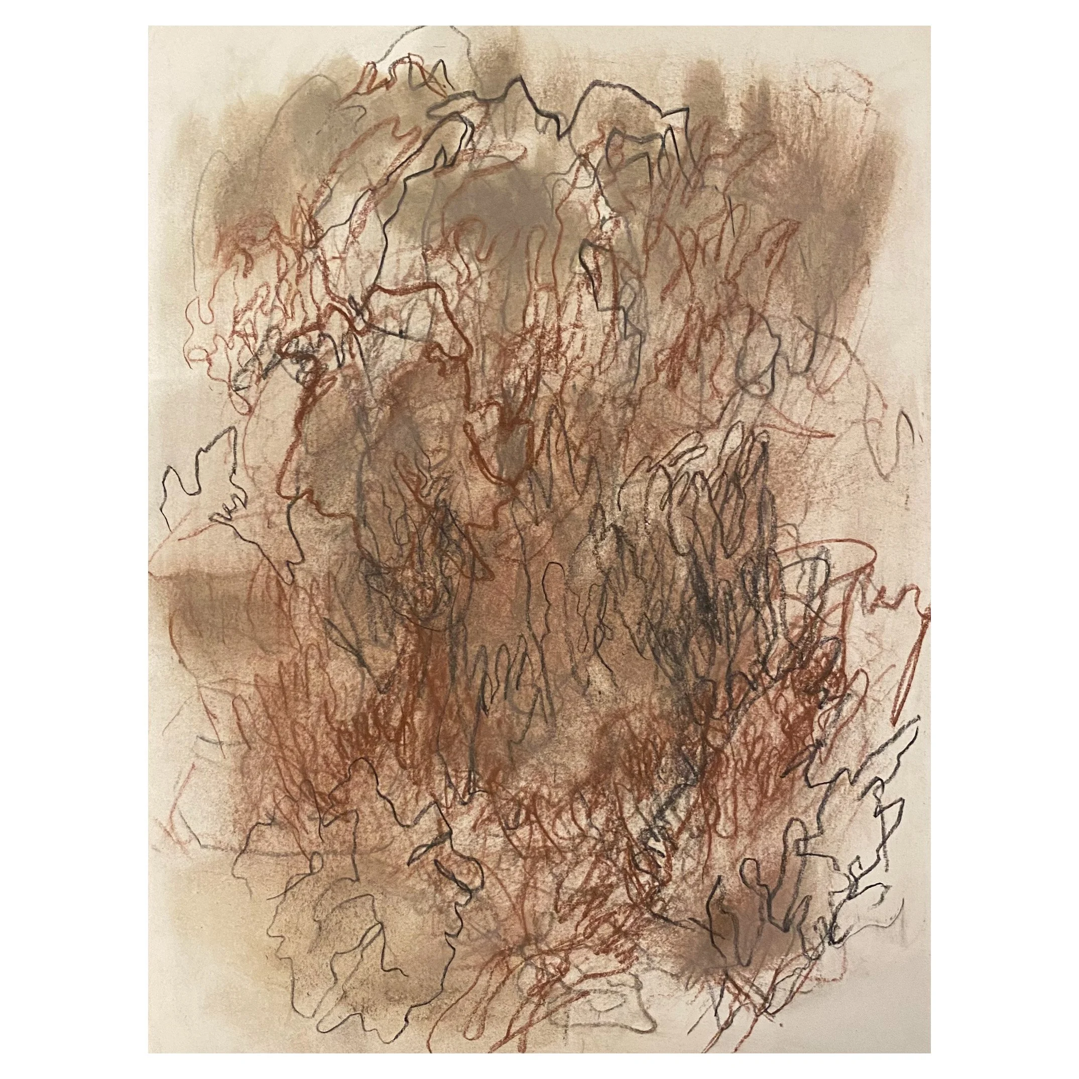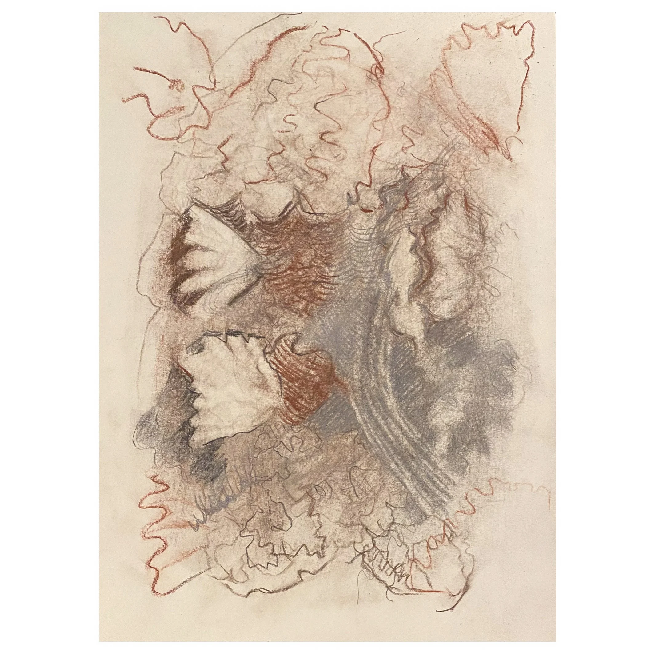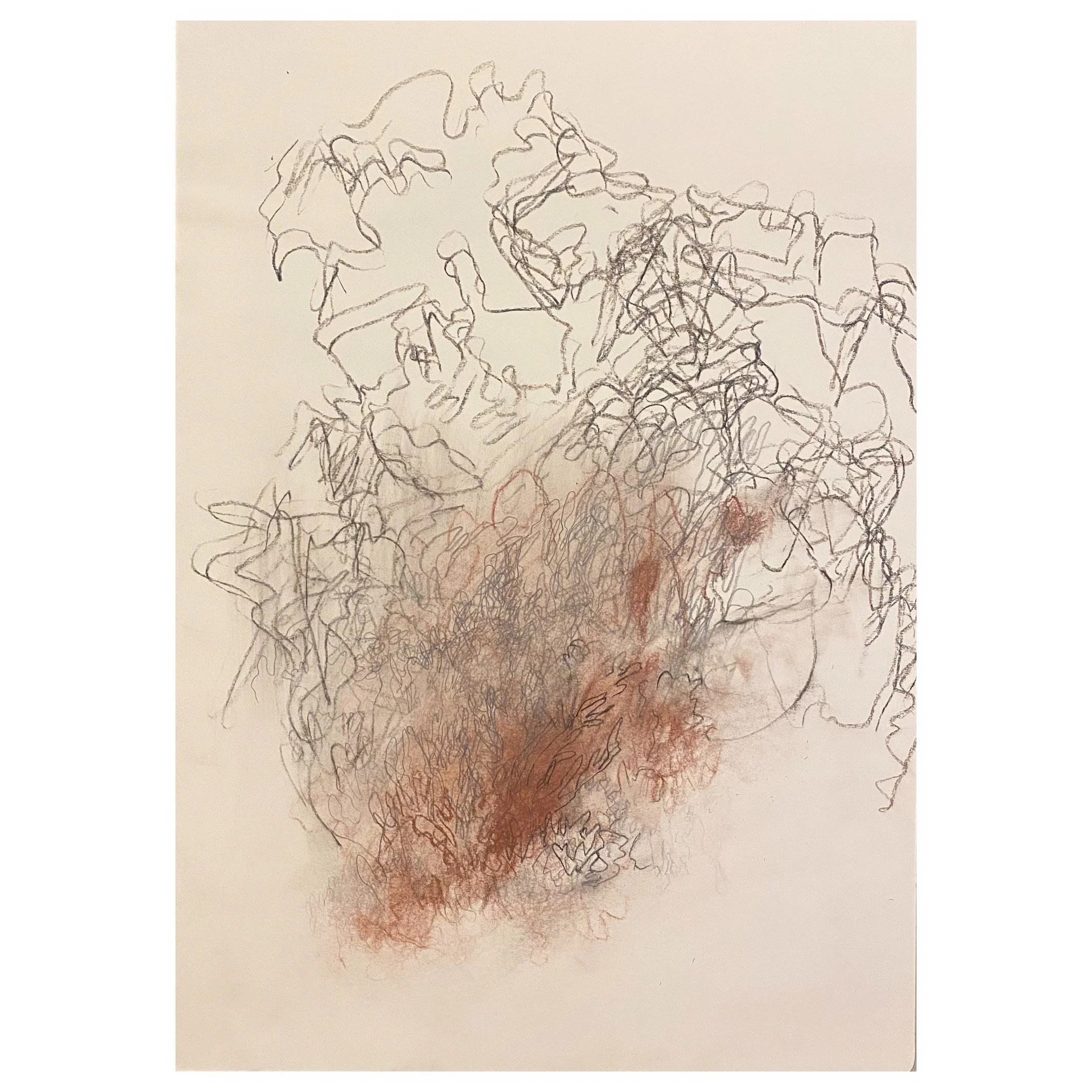 Untitled drawing, Charcoal, Graphite, Ash, Sanguine, 2024. Untitled drawing, Wood ash, Charcoal, Sanguine, 2024. Untitled drawing, Wood ash, Sanguine, Charcoal, 2024. Clam Shell, Hand milled oil paint with Italian earth pigments on Linen, 2024.